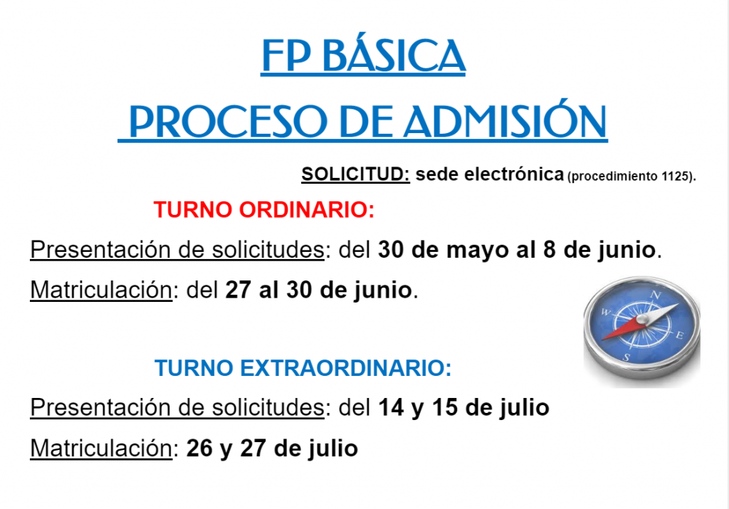 El próximo 30 de mayo se abre el plazo de admisión para todos aquellos alumnos que deseen estudiar el próximo curso (2022-23) un Ciclo Formativo de FP Básica.Los requisitos son los siguientes: Cumplir 15, 16 o 17 años durante el año 2022, es decir los nacidos entre los años 2005, 2006 y 2007. Haber cursado […]