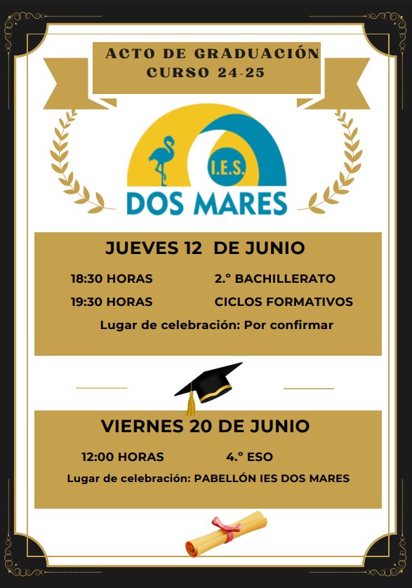 Os presentamos las fechas de graduación de los alumnos del IES Dos Mares. Este año daremos la enhorabuena a los alumnos de 4º de la ESO, Bachillerato y Ciclos Formativos.