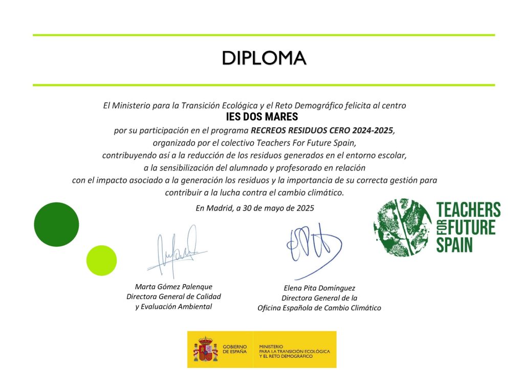El IES Dos Mares ha recibido un diploma del Ministerio de Transición Ecológica y Reto Demográfico por contribuir a la lucha contra el cambio climático. La participación en el programa de RECREOS RESIDUOS CERO 2024-2025, organizado por Teachers For Future Spain, ha contribuido a la reducción de residuos generados en el entorno escolar, a la […]