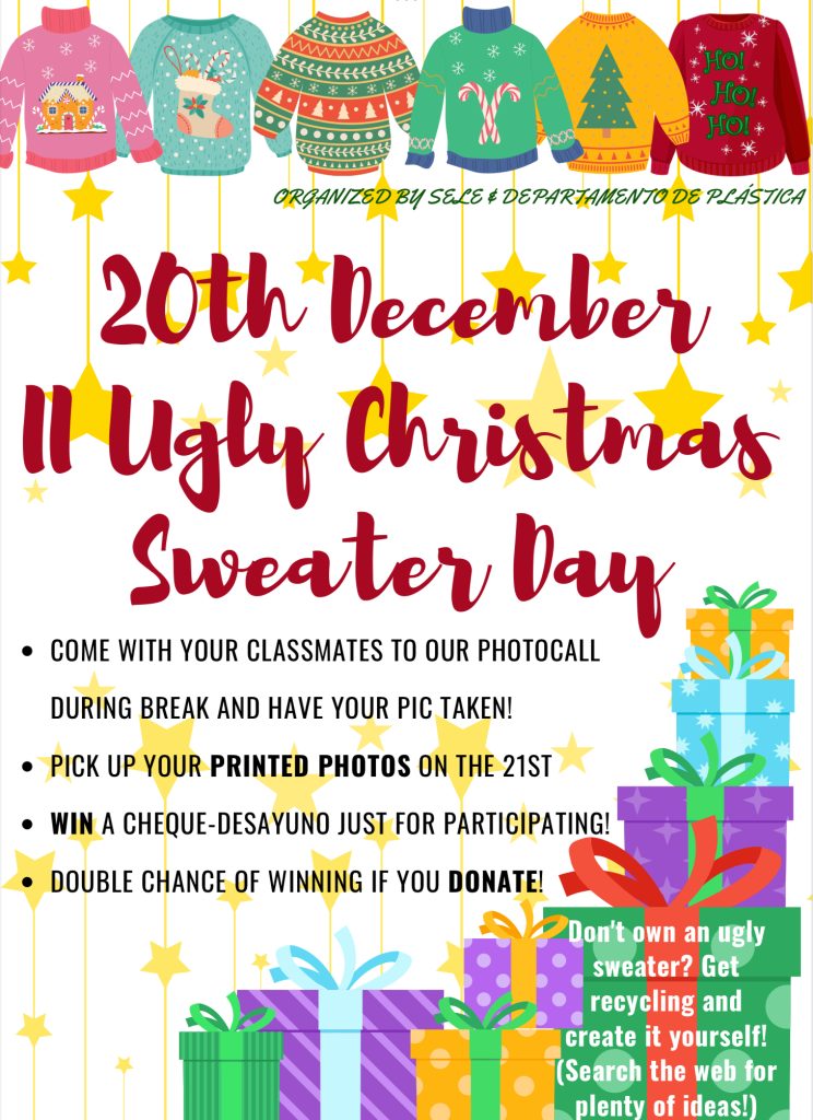 Recuerda que el martes 20 celebramos el II UGLY CHRISTMAS SWEATER DAY. Ponte tu jersey navideño y ve con tus amigos al photocall que instalaremos en el porche del patio a la hora del recreo. El miércoles podrás recoger tu foto impresa en la recepción y participar en el sorteo de varios cheques-desayuno. ¡ No […]