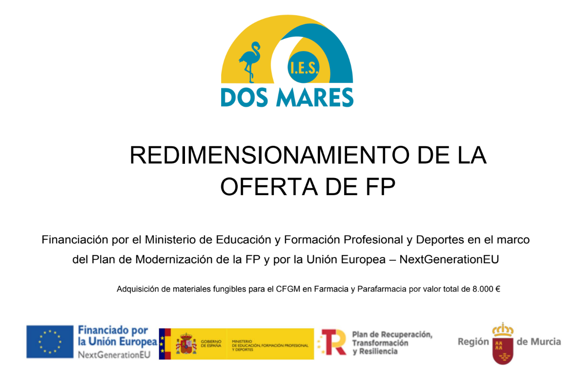 El IES Dos Mares recibe financiación por el Ministerio de Educación y Formación Profesional y Deportes en el marco del Plan de Modernización de la FP y por la Unión Europea – NextGenerationEU para la adquisición de materiales destinados a mejoras en el CFGM en Farmacia y Parafarmacia, ciclo que se imparte en horario vespertino en este centro desde este curso 2024/25.