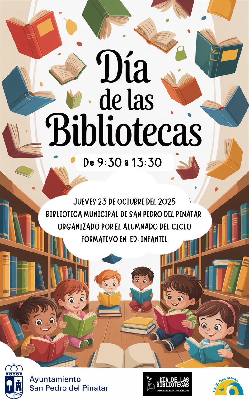 Con motivo del Día de las Bibliotecas, que se celebra cada año el 24 de octubre, el Ciclo Formativo de Grado Superior de Educación Infantil ha organizado una jornada muy especial destinada a los niños y niñas de Educación Infantil de todos los centros escolares del municipio. La actividad tendrá lugar en la Casa de Cultura de San Pedro del Pinatar y se desarrollará a lo largo del día con una variada programación.